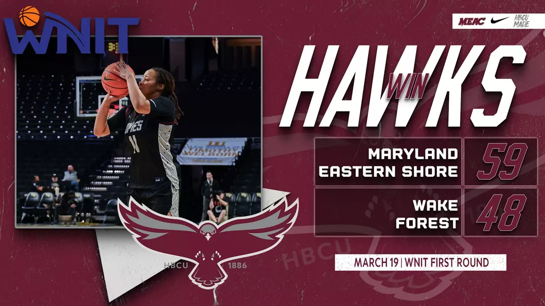 image via UMES Basketball 59 Winner UMES 48 WF Team 1 2 3 4 F UMES 12 15 13 19 59 WF 14 8 13 13 48 SUMMARY WINSTON-SALEM, North Carolina – The University of Maryland Eastern Shore women’s basketball team entered its first-ever postseason against Wake Forest in the first round of the WNIT. The Hawks took control early and earned their first-ever postseason win and first-ever win against a power conference opponent, 59-48, against the ACC’s Demon Deacons. THE SCORE Maryland Eastern Shore Hawks (20-14) – 59 Wake Forest Demon…