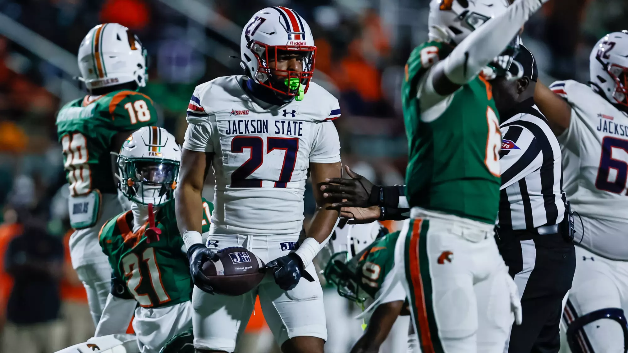 Malik Tobias added four receptions for 110 yards and two scores. Simeon Burns and Jakob Streeter added an interception to their totals. Tavias Higgs recorded a scoop-and-score following one of Cameron Rampersaud’s 1.5 sacks on the day.